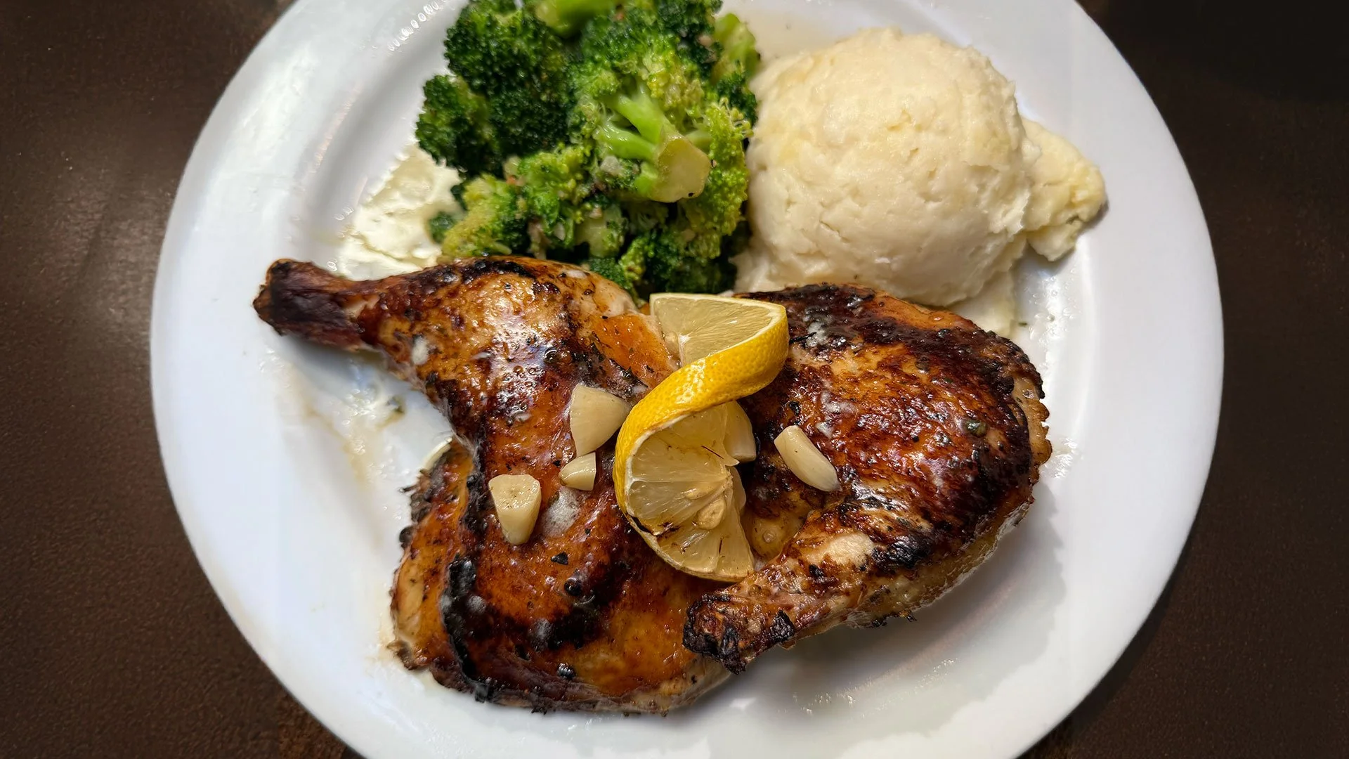 Marinated half chicken, lemon-garlic sauce, garlic mashed potatoes, vegetable of the day